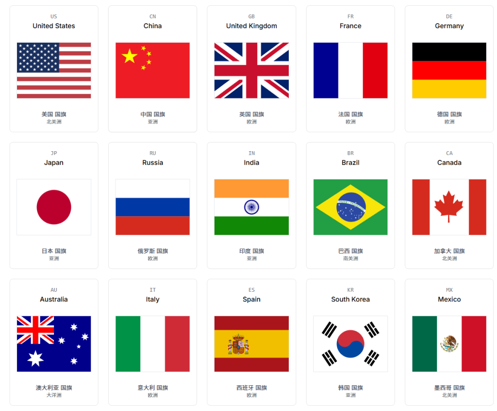 所有素材均可免费下载并用于商业项目,无需额外授权,省去版权困扰。分类直观,可按国家名称、洲际区域或旗帜特征快速检索,并提供 SVG、PNG、AI 等多种格式,适配不同设计工具与工作流。