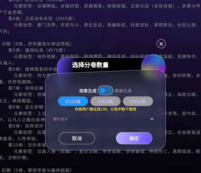 - 生成灵感:预设男频/女频数百个爆款的主题、情节、人设等。