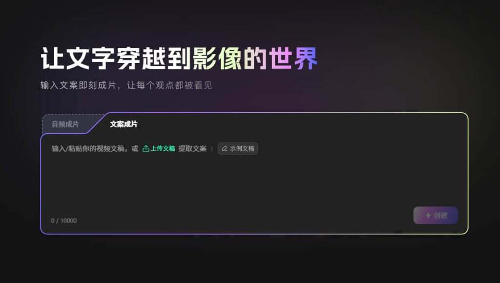 - 若仅有纯文字内容(无音频):点击“文案成片”,输入或粘贴文案,系统自动匹配素材、转场及配音,快速生成完整视频。
