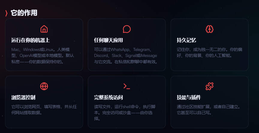 - 开源与可控性 项目开源,用户可自主部署在本地设备(如树莓派、Mac Mini、Windows电脑),完全掌控基础设施,避免科技巨头的垄断。
