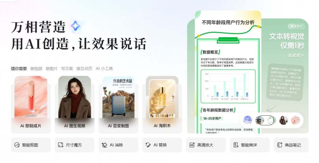 万相营造 是一个由阿里巴巴集团旗下阿里妈妈推出的综合性营销创意平台,旨在通过人工智能技术帮助商家和营销人员更高效地创建、管理和优化他们的营销内容。该平台集成了多种AI工具和创意资源,提供从图片处理、视频制作到文案撰写的全方位服务,以提升营销效果和用户体验。