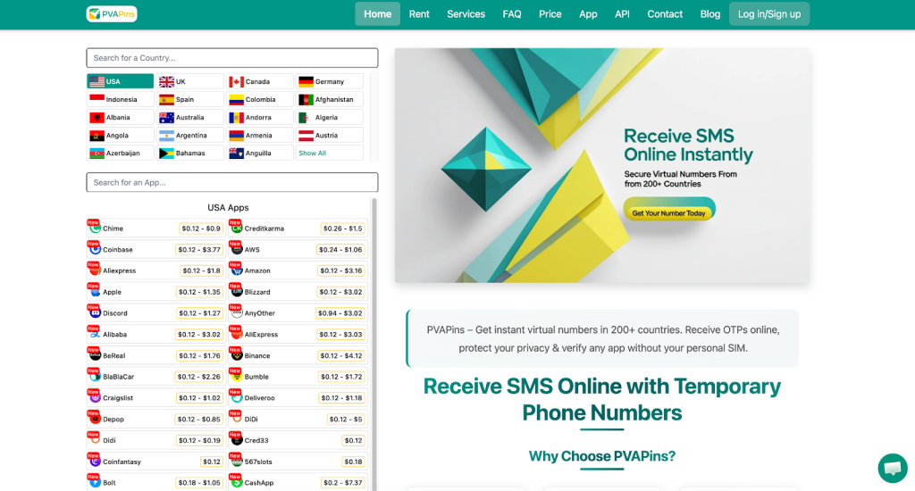 PVAPins 提供来自 200+ 国家/地区 的临时虚拟号码,用于在线接收短信验证码(OTP)。你可以按需要选择: