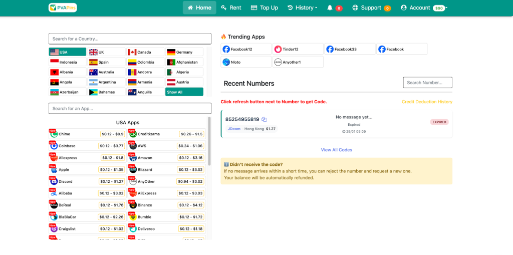 👉 现在就到 PVAPins 选择国家号码,在线接收验证码(OTP):