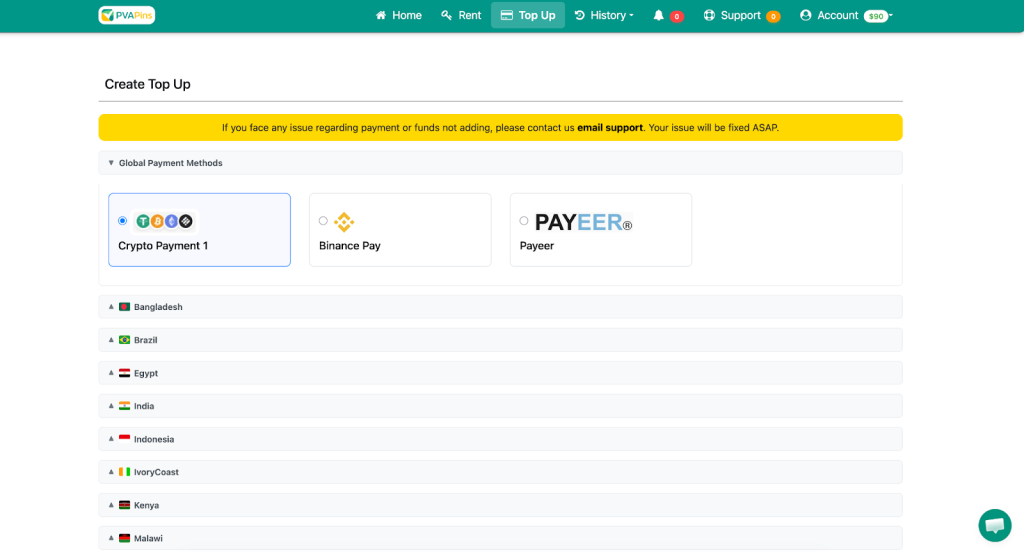 PVAPins 支持多种常用支付方式(包含加密货币等),适合不同地区用户充值使用。