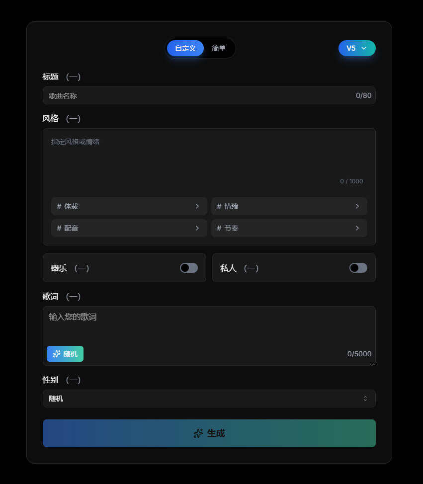 - 支持自定义:风格、情绪、节奏、乐器、人声性别、是否纯音乐等。