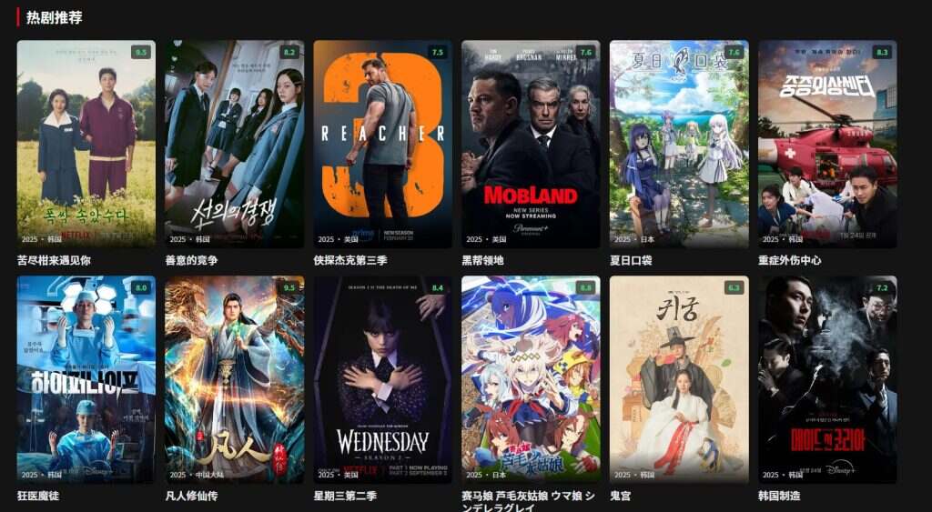 - 热剧推荐:展示当前最受欢迎的电视剧,按评分排序。
