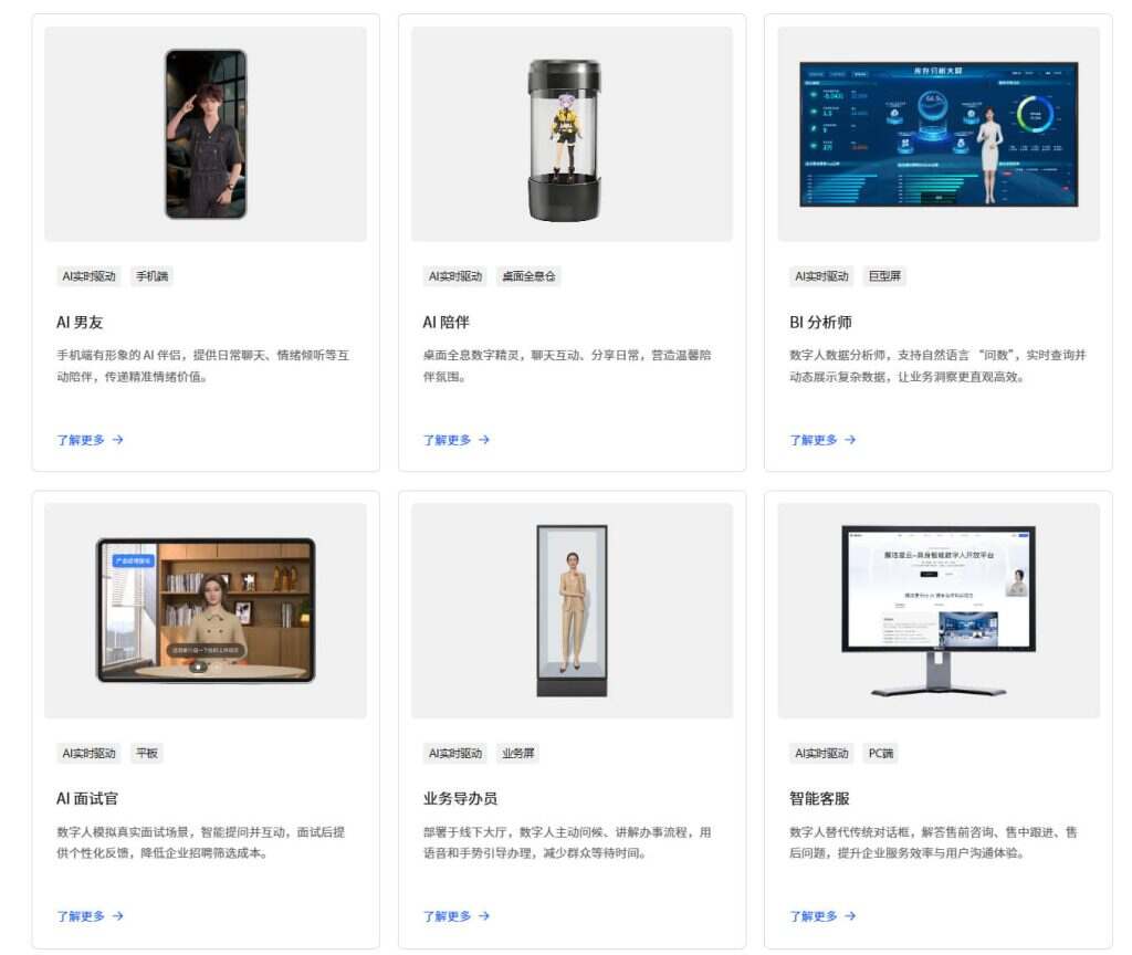 - 提供多种应用场景,如AI男友、AI陪伴、BI分析师、AI面试官、业务导办员、智能客服、AI助教、英语陪练、电视助手等。