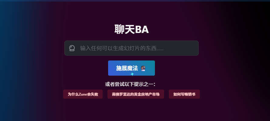 ChatBA是一个强大的人工智能驱动的AI生成PPT工具,用于自动生成幻灯片。该工具使用OpenAI的API,根据用户提供的提示或主题快速生成幻灯片。