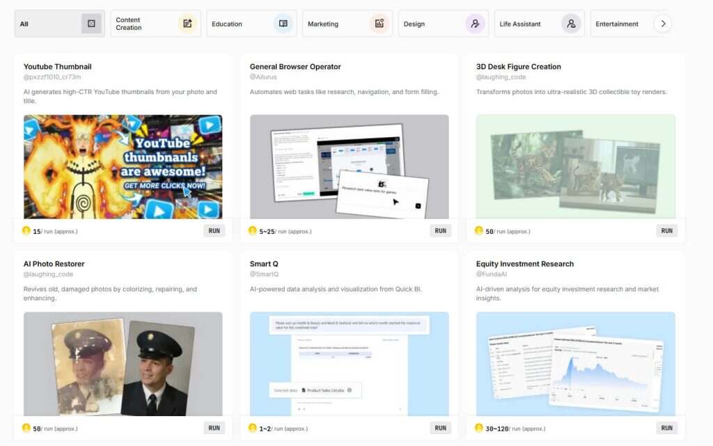 - 海量AI代理聚合 覆盖数百个细分领域的AI代理,包括但不限于:智能客服、文案生成、代码编写、数据分析、市场预测、多语言翻译、图像/视频生成等,满足从个人创作者到大型企业的多样化需求。