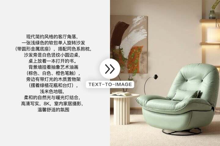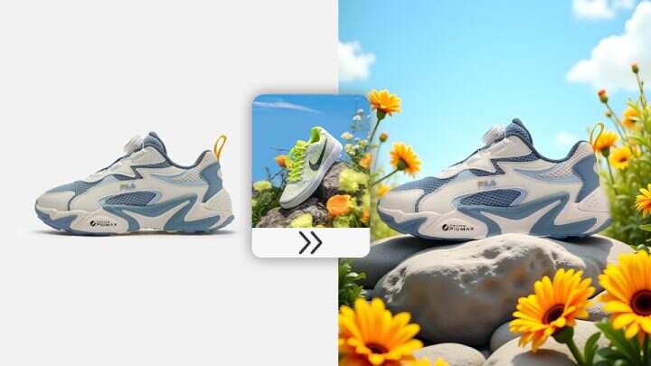 输入商品图+背景图,AI快速实现场景融合,无需复杂布景与拍摄,避免权问题,降低成本并加速产品上市。
