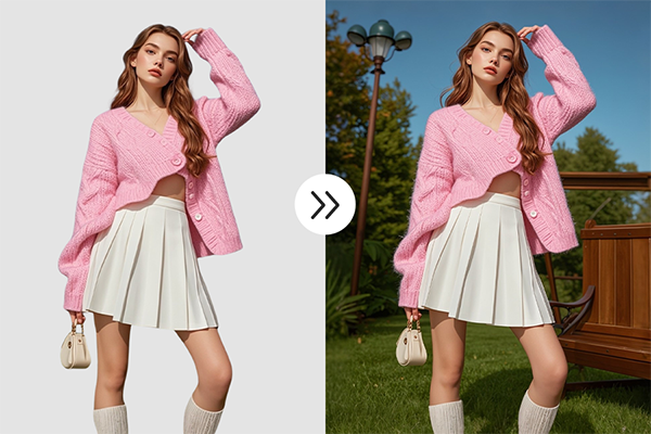 自动识别人物主体,根据文本描述(如“阳光沙滩”“都市夜景”)或上传参图,智能生成匹配背景。轻松切换节日主题、季节氛围、品牌调性场景,提升视觉吸引力。