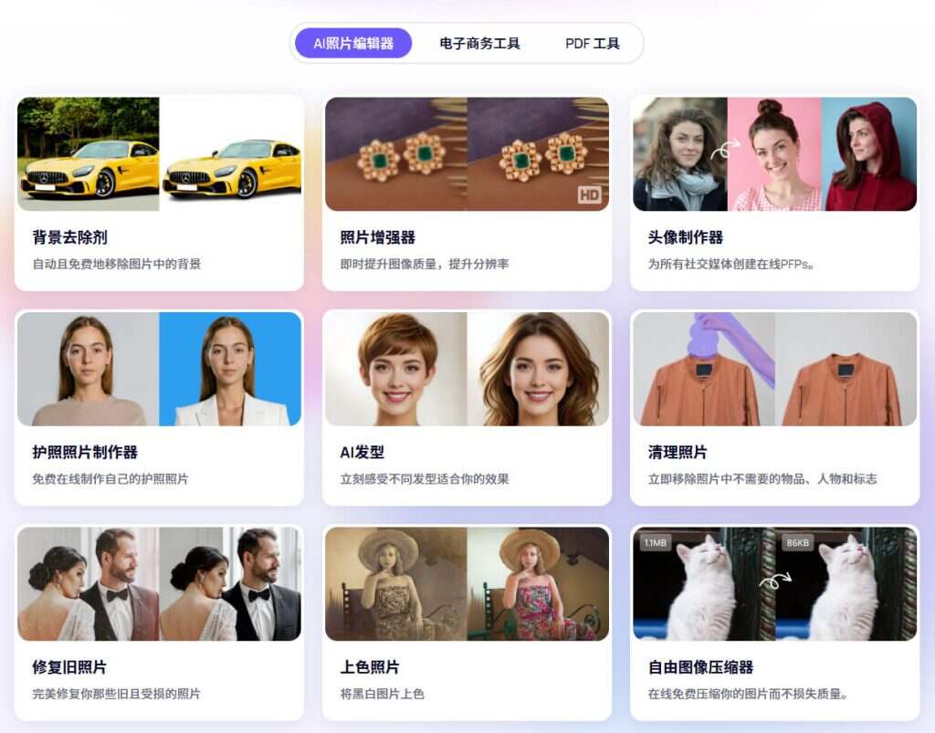 提供超过20种生成式AI工具,旨在简化图像编辑流程、提升视觉内容质量。该平台的核心功能包括AI换装、背景移除、照片增强、老照片修复、发型模拟、图片清洁及证件照制作等