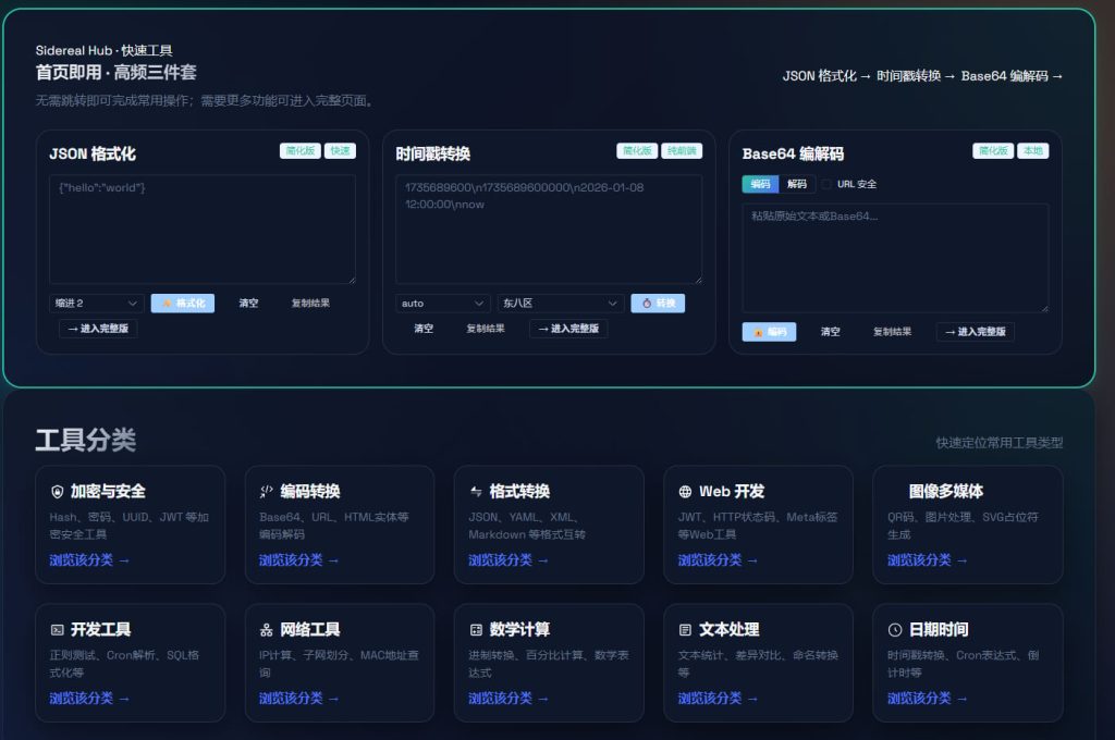 云织星・工具台(Sidereal Hub)是面向开发者与内容创作者的百宝箱式在线工具箱,以 Vue3 + FastAPI 构建,集成100+ 高频工具与AI 资源导航,一个集成了100+种常用工具的聚合网站,覆盖开发、办公、生活等多个场景。