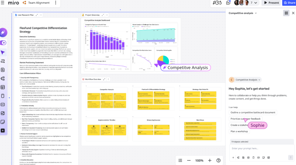 小技巧:在画布上输入“/”后选择“AI Assistant”,输入如“为新产品发布创建一个包含市场分析、功能列表和风险点的思维导图”,AI 会瞬间生成结构化的视觉内容,大幅减少手动绘制时间。