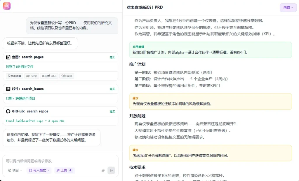 它以自然语言交互为核心,无需复杂格式与繁琐排版,通过 AI 快速生成、拆解、优化产品需求,同时支持需求评审、逻辑校验、版本管理等场景,大幅缩短 PRD 撰写与对齐成本。