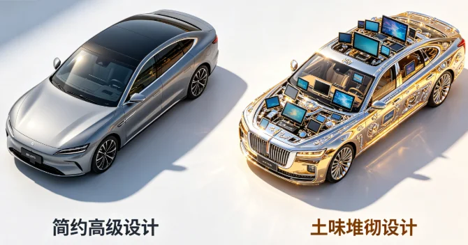 咱们得承认,早些年甚至是现在,很多国产车的设计给人的感觉就是“用力过猛”。这就好比一个人刚富起来,急于证明自己有钱,于是把金链子、大金表、名牌Logo全都挂身上,生怕别人看不见。这种设计心理投射到车上,就是满身的镀铬装饰条、硕大无比的进气格栅,还有车里那一块又一块恨不得把前挡风玻璃都挡住的大屏幕。