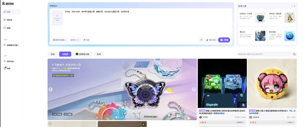 - 功能:AI产品设计、3D建模、供应链打样、创作者社区