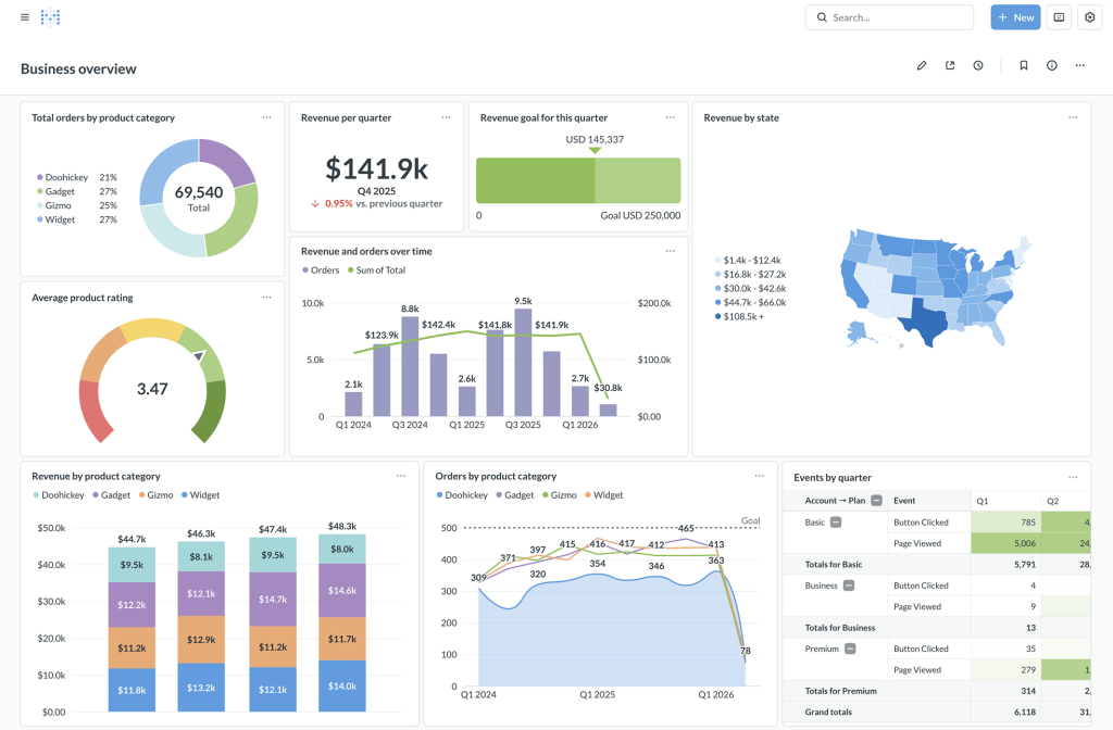 - 交互式看板:可以将多个图表组合成交互式仪表盘,支持添加过滤器实现数据联动(如点击某个地区自动筛选相关数据),并设置定时自动刷新。