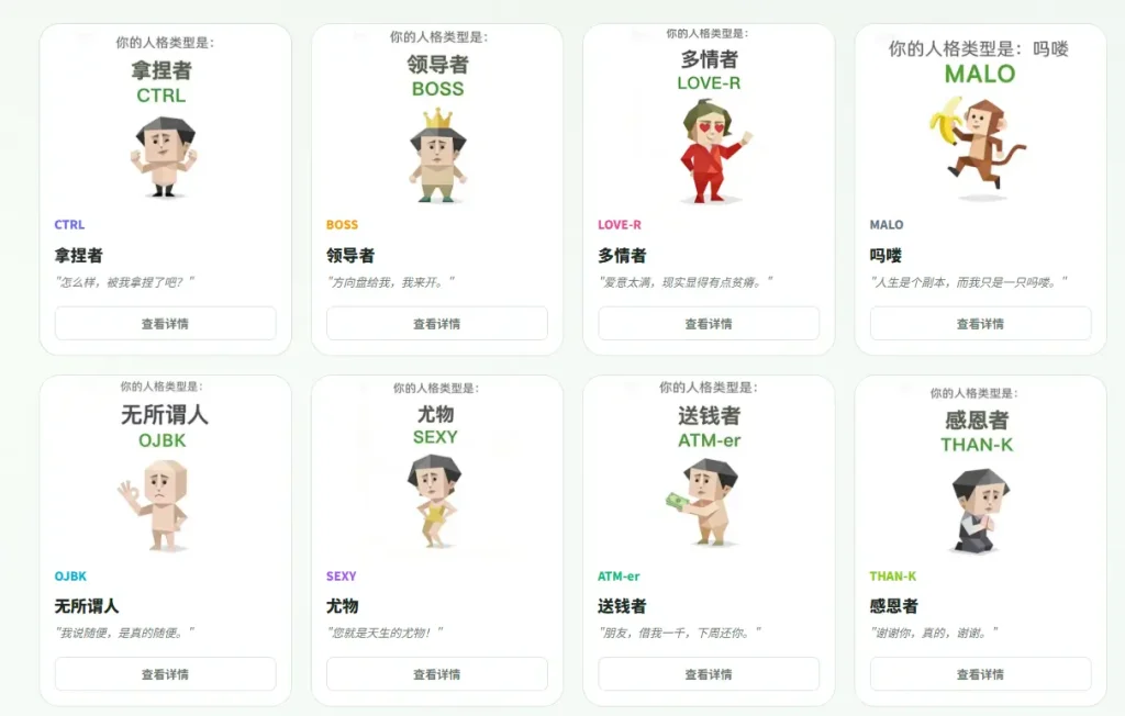 SBTI 人格测试 在线工具、有意思的网站 2026-04-10 SBTI 的官方全称是Silly Big Personality Test,直译过来就是 “愚蠢的大型人格测试”,也有网友玩梗给它起了个贴合内容的全称:Social & Behavioral Type Indicator(社交行为类型指标)。 这里要先跟大家明确核心定位:SBTI 从头到尾都是纯娱乐向的恶搞人格测试,没有任何专业心理学理论支撑,也没有经过严谨的量表信效度验证,本质是当代年轻人用来自嘲、情绪宣泄、社交玩梗的网络产物,绝对不能当作专业的人格测评工具使用。 立即测试 在线工具 有意思网站 上一篇 SBTI 人格测试全面深度解析 下一篇 Anthropic – AI 安全人工智能公司 延伸阅读: 热度 时效 暂无内容!