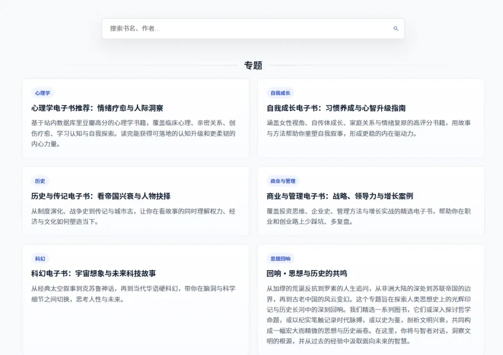 - 智能搜索与分类:支持按书名、作者、关键词精准搜索,并有细致的分类与标签系统方便浏览。