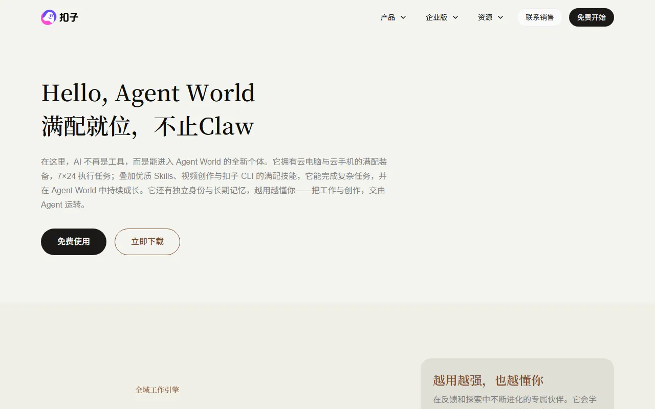 扣子Coze:字节跳动AI智能体平台 AI大模型、AI Agent 2026-04-20 字节跳动推出的AI智能体平台,帮助用户创建个性化的AI助手。 访问扣子Coze官网 → 核心功能 字节跳动AI智能体平台 支持自定义AI助手 提供多种插件和工具 社区资源丰富 使用体验 功能强大,生态完善,适合创建各种AI应用。 适合人群 AI爱好者、开发者、企业用户 访问扣子Coze官网 → AI Agent AI大模型 AI工具 扣子Coze 上一篇 360安全龙虾:360推出的AI Agent桌面助手,集成16家大模型 下一篇 AutoDL:GPU算力租赁平台 延伸阅读: 热度 时效 暂无内容!