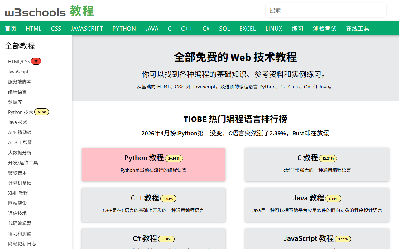 W3Schools提供简洁易懂的Web开发教程,在线编辑器可以直接运行代码,是编程入门的绝佳起点。